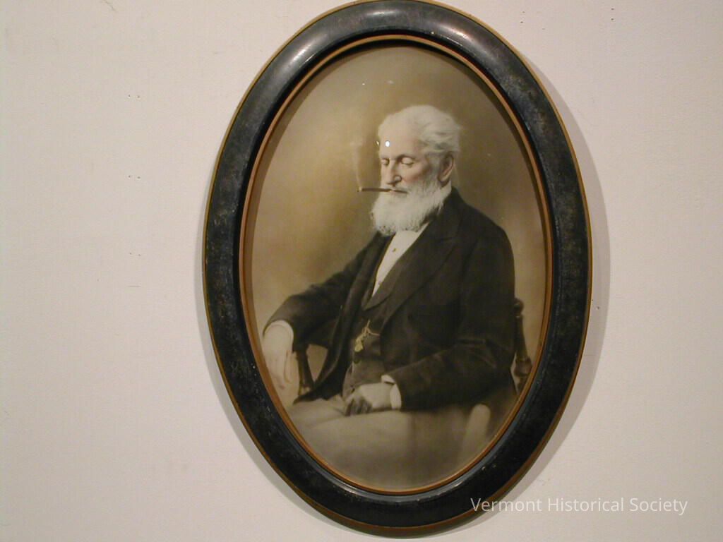 This portrait is of an older man, who is sitting in a chair and shown from the waist up. He has white hair, sideburns, a mustache, and a full beard. He is wearing a white shirt with gold buttons, and a watch chain is visible. The man's left arm is resting on the arm of the chair, while his right arm is resting in his lap. He is smoking a cigar and looking down. The portrait is displayed in an oval frame with a domed glass. It is a partially colored crayon enlargement.