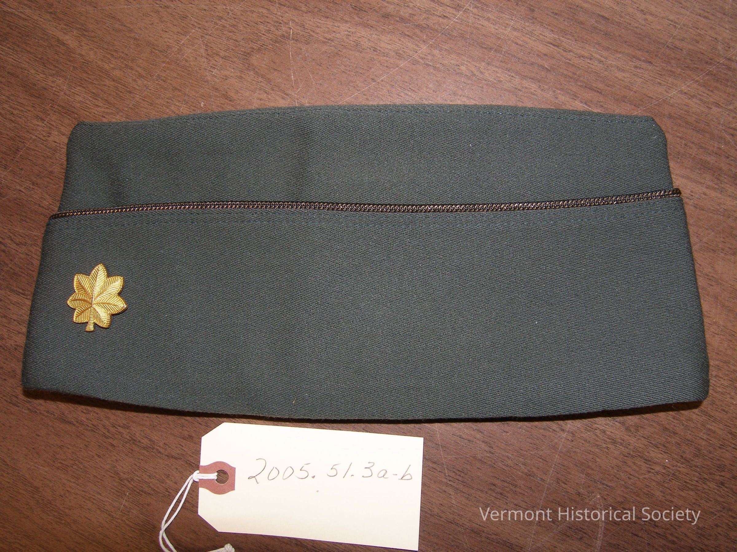 Green twill garrison cap decorated with gold piping around the edge of the brim. It has a brass insignia in the shape of a 7-pointed leaf. The label, "TOP RANK - - - Louisville Cap Corp., Louisville, KY." is printed on the inside.Context