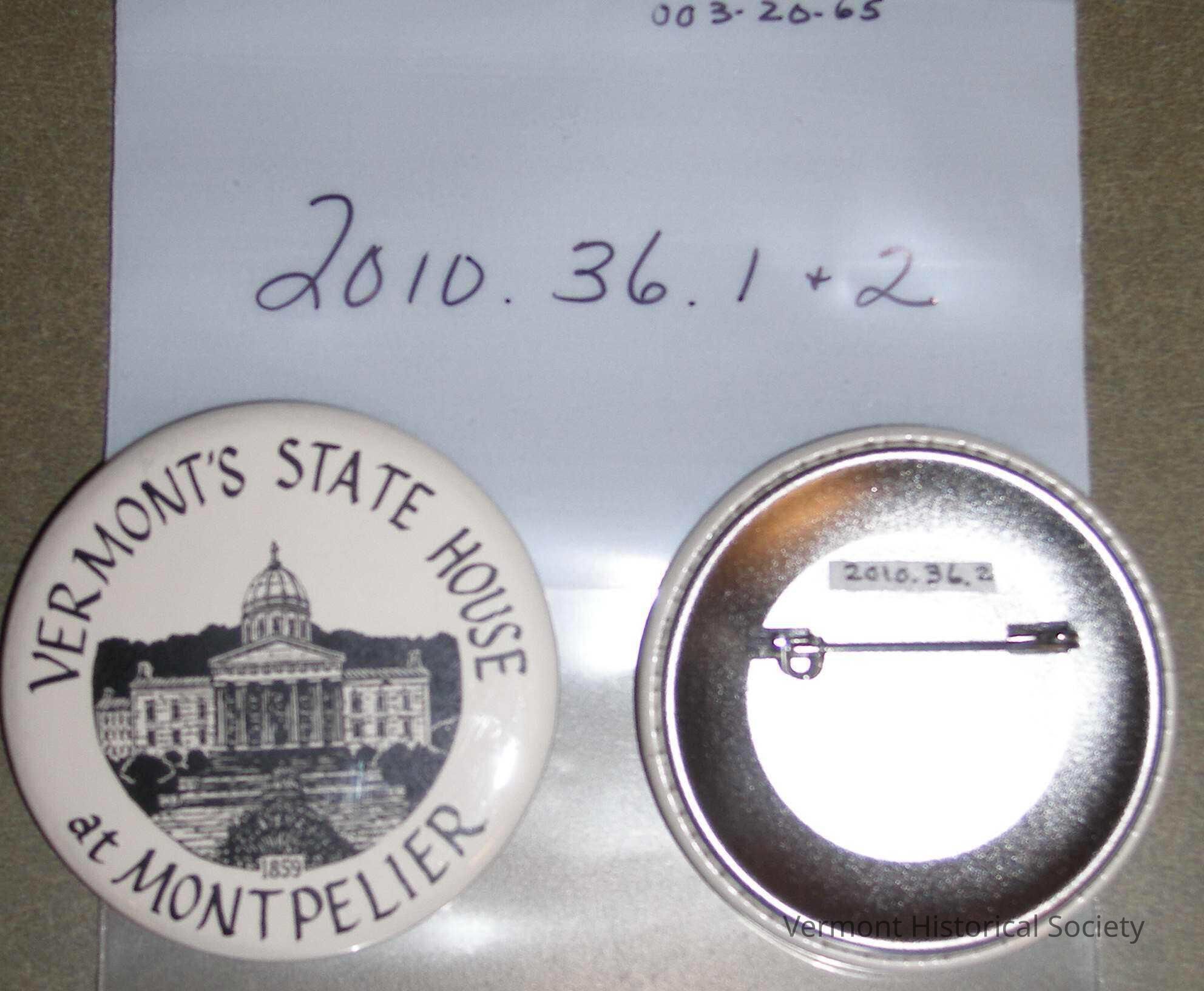 Round white button with an illustration of the Vermont State House in the center and the words, "VERMONT'S STATE HOUSE at MONTPELIER", around the edge.Context