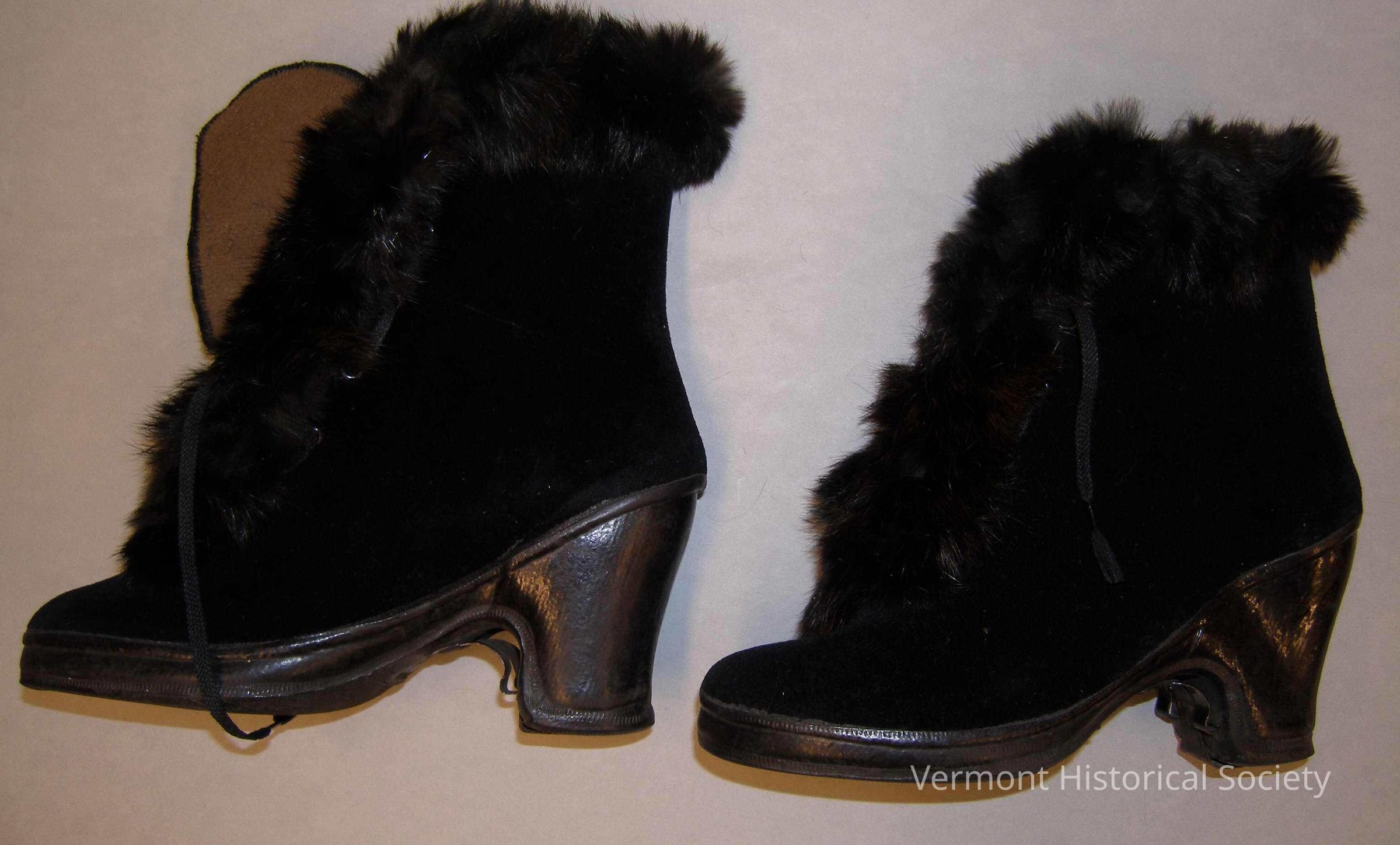 Black heeled boots trimmed with fur. The uppers are black suede, and the sole and heel are rubber. The heel is reinforced with a metal bracket. The boots secure with laces over a long tongue.Context