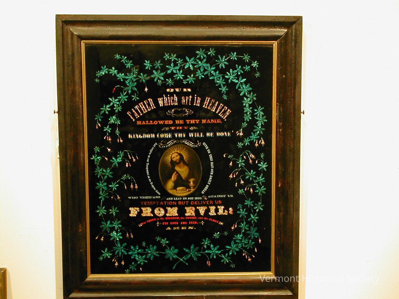 Reverse foil painting on glass depicted the words of the Lord's Prayer. The images has a border of green foil leaves, and an illustration of a man [Jesus] blessing a bread roll and a goblet. The words of the prayer are written in the center in several fonts and orientations in both white and red.Context