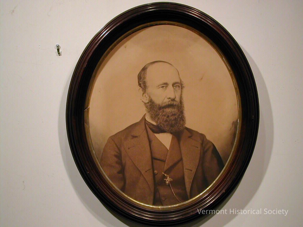 This oval portrait depicts a man who appears to be middle-aged. He is wearing a white shirt, a black stock or bowtie, a vest, and a jacket. He has a high forehead and a full beard. Additionally, he is wearing a pocket watch, which is attached to a chain that is clasped in the buttonhole of his vest. An ornament on the fob is heart-shaped in design.Photograph Details