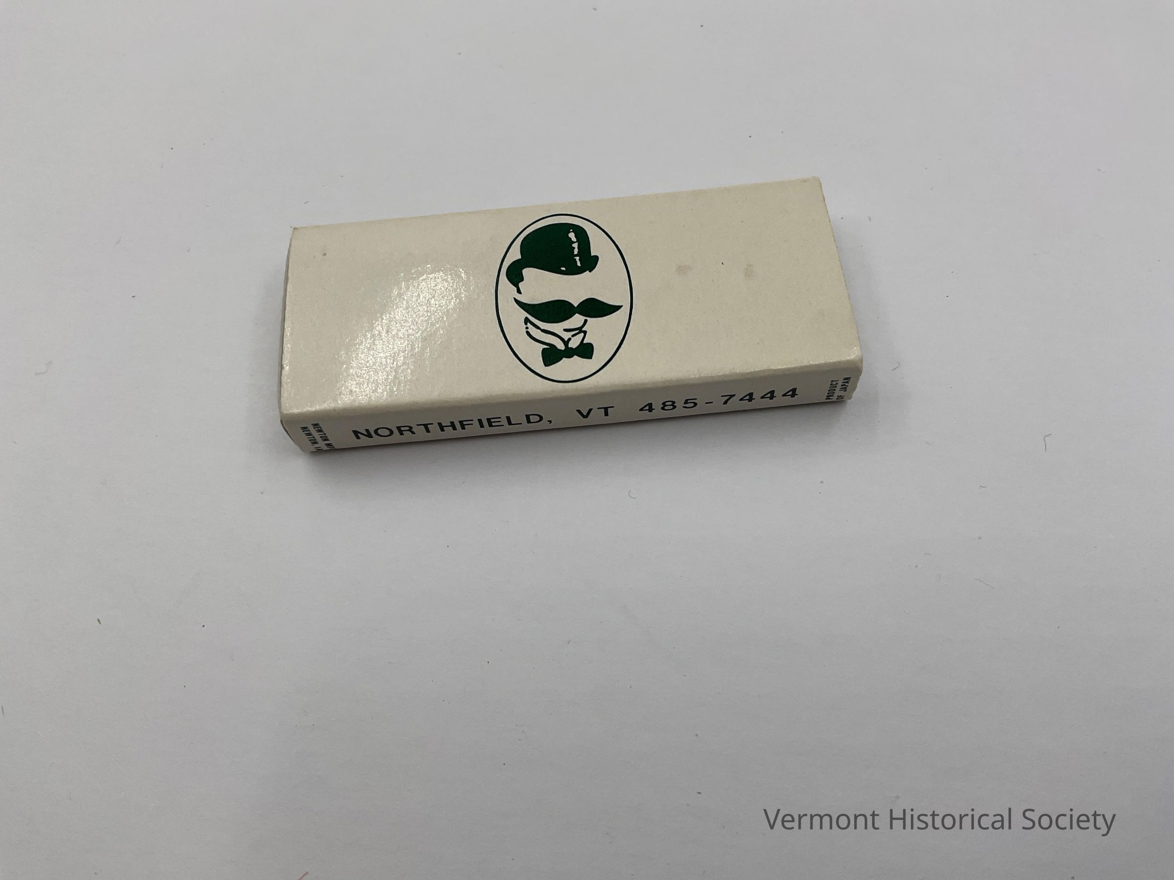 White box of green tipped, wooden matches with the green image of a faceless man in a top hat, mustache and bow tie. On the opposite side printed in green is the name of the eatery: Cameron's Restaurant, Uncommon cuisine on the Common." On one side is the location and phone number - Northfield Vt. 485-7444. In tiny print on the ends of this side is manufacturing information that says, "Product of Japan," and "Newton Mfg., Newton, IA."Context