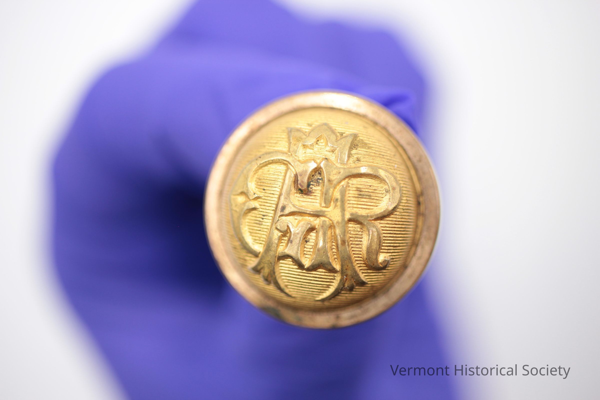 Four brass, post-backed coat buttons molded with the intertwined letters, "GAR".