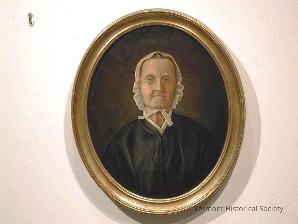 Oval portrait showing an elderly woman in a white bonnet and black clothing. She is wearing gold-framed, oval glasses. The bonnets is tied in a small bow beneath her chin. Her clothing is quite loosely draped and may be either a dressing gown or a shawl.Type of Painting