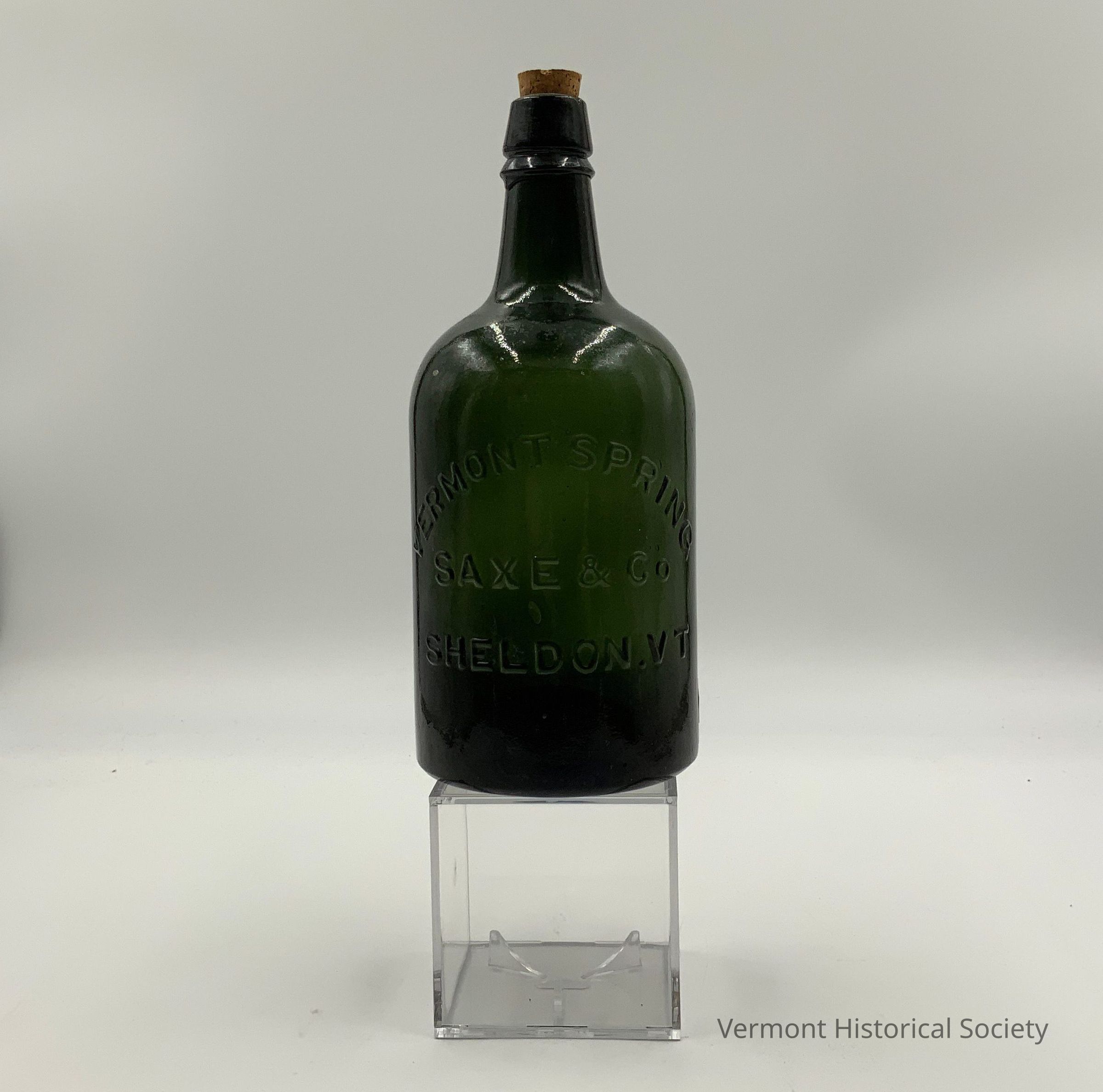 Dark green glass bottle for local mineral water. The bottle (a) is a round cylinder with long neck and indentation near top. Traces near indention suggest perhaps a wax cover (no longer present) and there is a dried cork (b) still in place. "VERMONT SPRING" is stamped in a rounded half circle using protruding block letters in all capitals. Beneath is "SAXE & Co" beneath which is "SHELDON, VT."