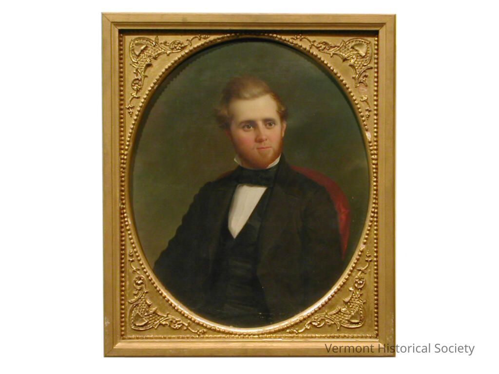 Oval portrait showing a man wearing a black suit jacket and vest, a white shirt with a high collar, and a black tie. He has light brown hair and a small beard beneath rosy cheeks. He is sitting in a red chair.Artwork Details