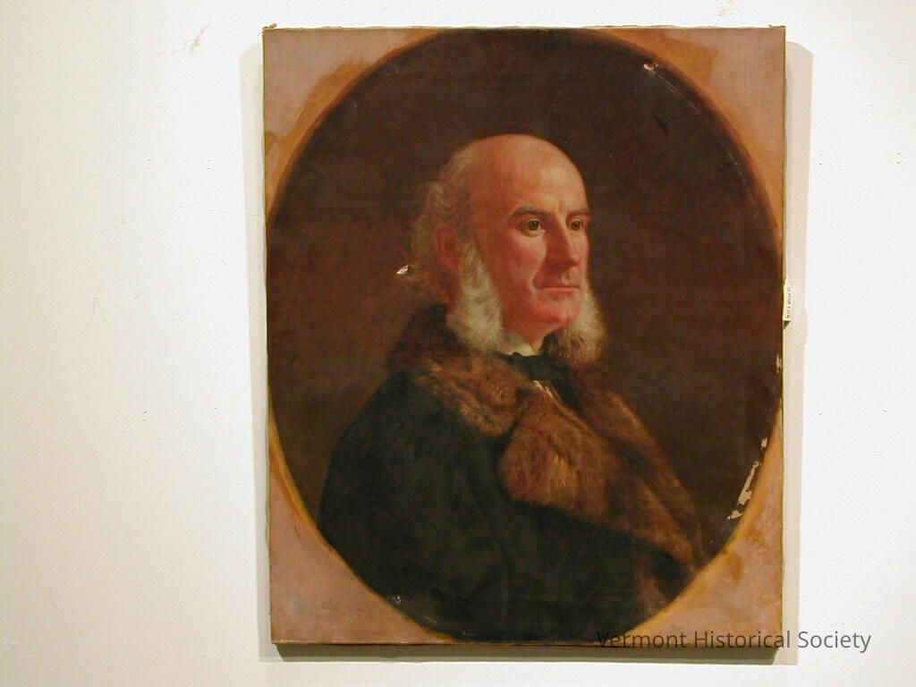 Unframed oil on canvas portrait of a man with long, bushy sideburns. The top of the man's head is bald, and he is facing to the viewer's right. He is wearing a thick coat with fur lapels. The painting is within an oval area on the rectangular canvas.Type of Painting