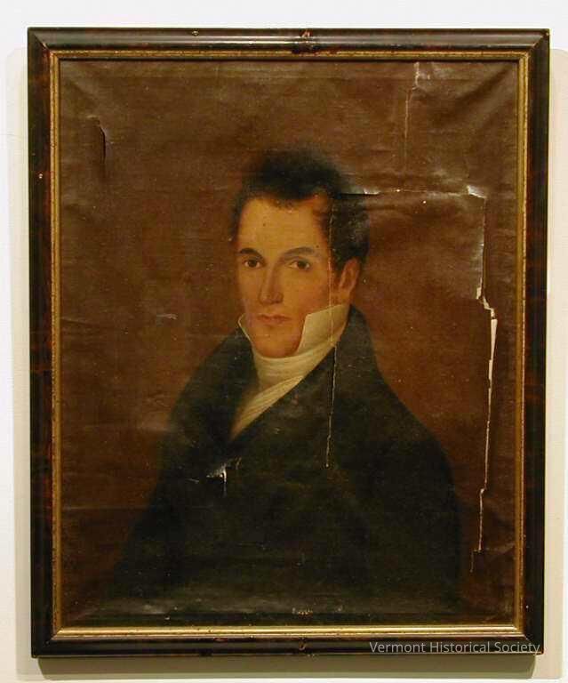 Portrait showing a man with light-colored skin and short, dark hair. He is wearing a white shirt with a high, pointed collar, a white stock, and a black coat. The background is brown. The painting is in a wooden frame with a narrow gilded border along the interior edge.Type of Painting