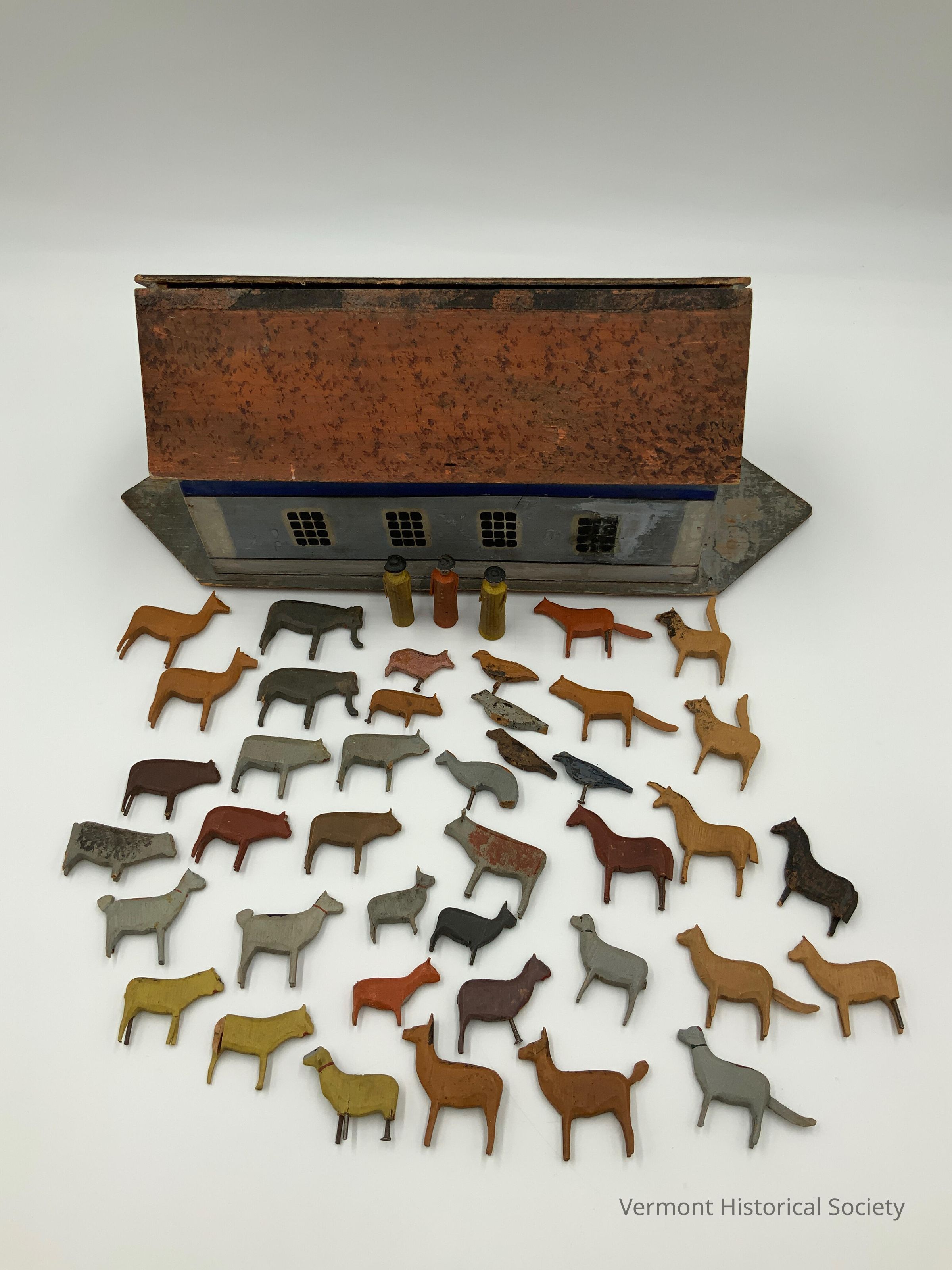 Noah's Ark toy consisting of a boat box/case, several animals, and 3 people. The boat is made of wood with a base that extends long on two ends. It has a peaked roof, and one side of the roof removes to open the case. It sits on the boat with two very small wooden dowels (toothpick sized) at the base. The animals include 5 llamas, 7 dogs, 2 elephants, 1 peacock, 5 cats, 6 pigs, 4 birds, 2 cows, 2 foxes, 1 sheep, 2 horses, 1 unicorn, and 2 that could not be identified. Many of the animals have had broken legs replaced with nails.Context