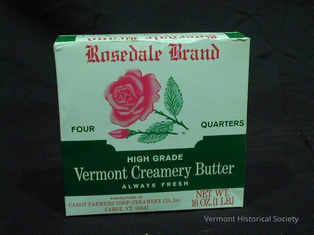 One pound butter carton and wrappers from Cabot Farmers' Coop. Creamery, Inc. in Cabot, Vt. Rosedale brand. Carton is white and green with a red rose just under the words "Rosedale Brand." The lid is a and the base of the box is b.Acquisition