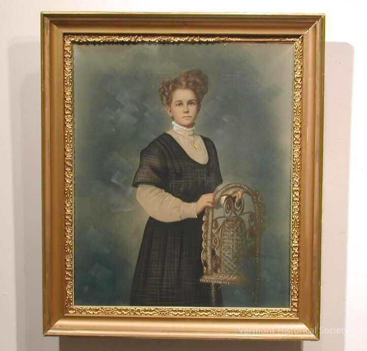 Crayon enlargement showing a young woman wearing a black dress with a white yoke and white sleeves. She has light skin and blond hair swept upward on her head. She is resting her hands on a piece of decorative wicker furniture.Photograph Details
