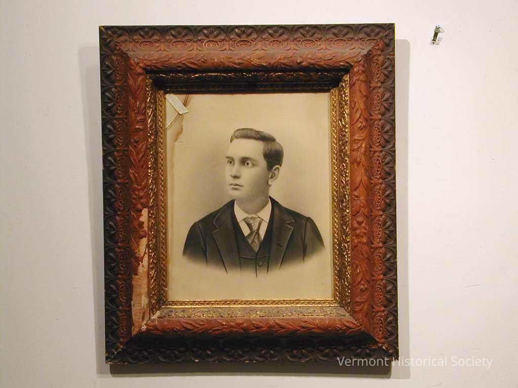 Crayon enlargement showing a young man with white skin and dark hair. His hair is parted on the side and cut short. He is wearing a white shirt with a midtone tie, dark vest, and dark jacket. The portrait is held in a decoratively molded frame that is dark colored around the edge and light colored in the middle.Photograph Details
