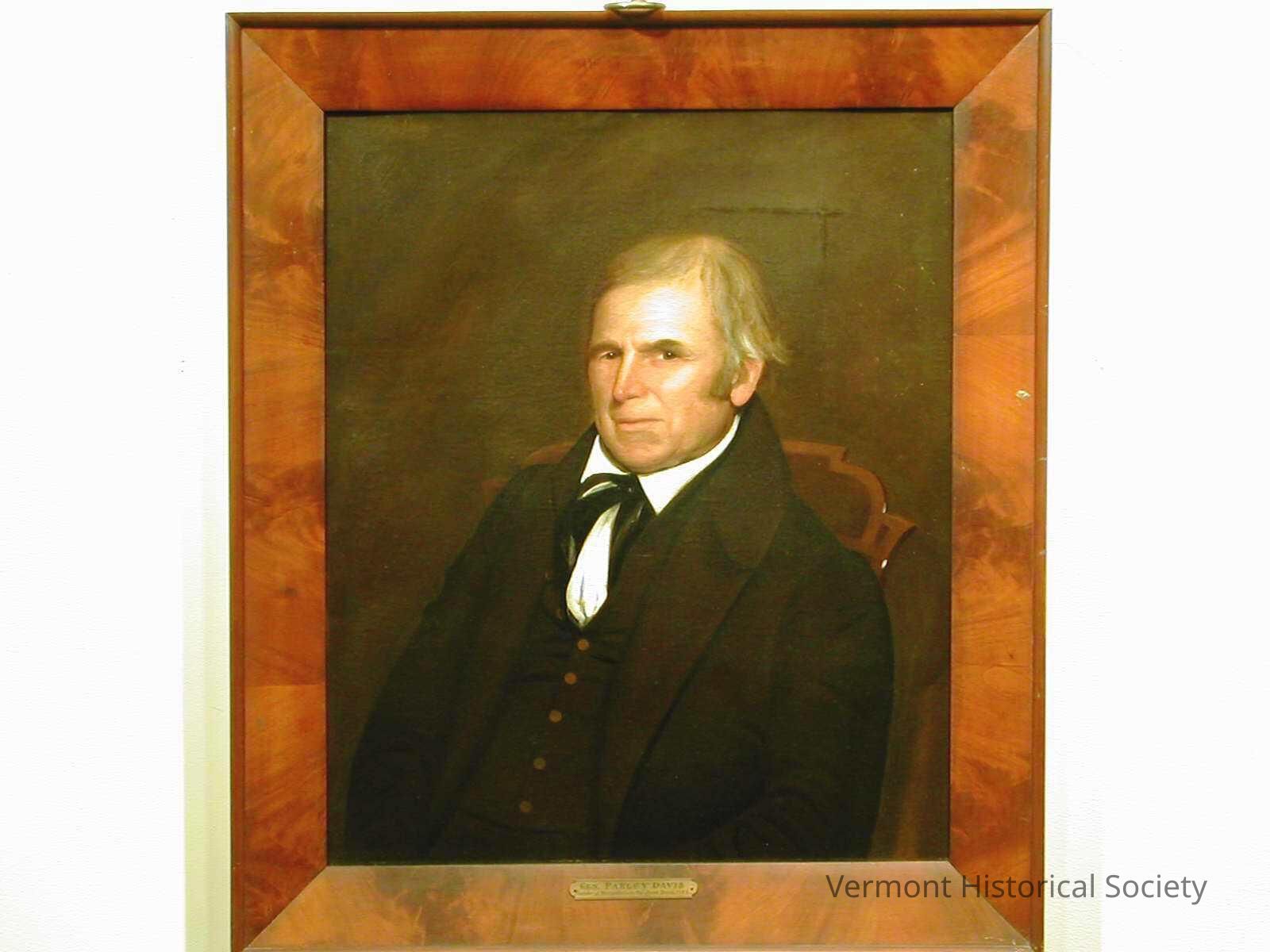 Portrait of a seated man. He has grey hair and short sideburns. He is shown wearing a suit consisting of a black coat, vest, and cravat, and white shirt with a falling collar. Is is seated in a wooden chair. The whole is framed in a veneered wooden frame with simple molding.Type of Painting