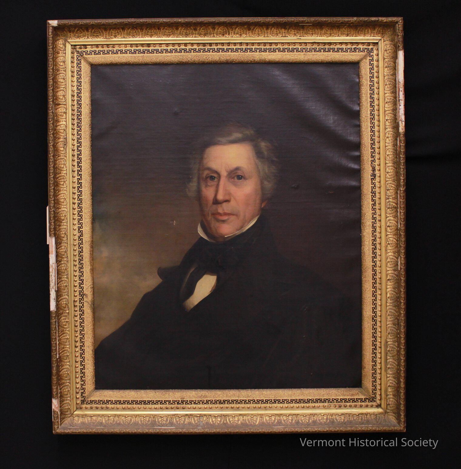 Portrait of a man with grey hair. He is shown from the waist up at a 3/4 angle wearing a black suit, black stock, and white shirt with standing collar.