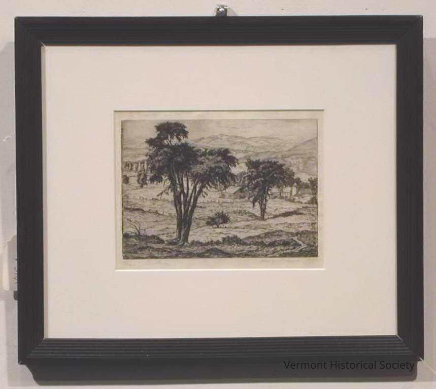 Landscape with an elm tree prominently placed in the left foreground. There is another elm to its right in the middle ground. Stone walls, fences and a hilly field complete the fore and middle grounds. A farm with several outbuildings is behind the smaller elm. There are mountains in background, and granite derricks are also shown in the background to the right.