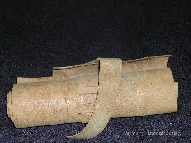 Leather account case or roll. The long strip of leather is stored rolled up and unrolls to expose alphabetized slots to hold narrow paper receipts and payment notations. The slots are formed by weaving a narrow strip of leather through evenly-placed slits along the center of the roll.