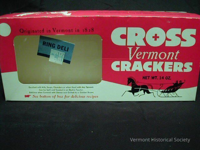 Cross Vermont cracker box. Red, white and black. Front has clear cellophane window and image of a horse and sleigh. Contained crackers in plastic bag. Last cracker disposed of on May 21, 2002. Recipes on back.