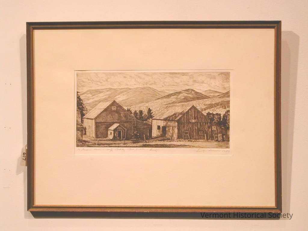 Landscape print showing a farm complex consisting of 2 barns. A portion of another building is visible at the left edge. The horizon is formed by a row of close, large mountains, and the sky is cloudy. Beneath this image is the handwritten inscription, "To Governor Davis Happy Birthday Nov 7, 1972 - Luigi" in pencil.