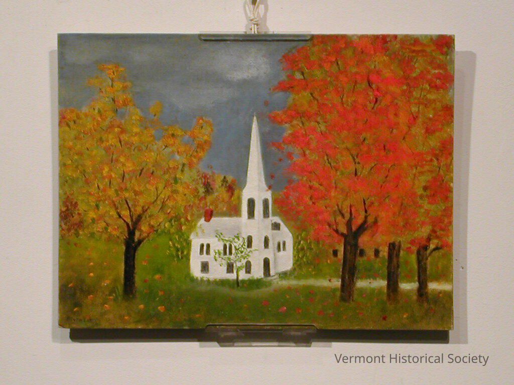 Landscape painting showing a white church with a steeple and a chimney. There is one tree with gold leaves to the left, and three trees with orange leaves on the right. There is a path leading from the church to the right edge. There is grass in foreground, and a blue sky in background.Artwork Details