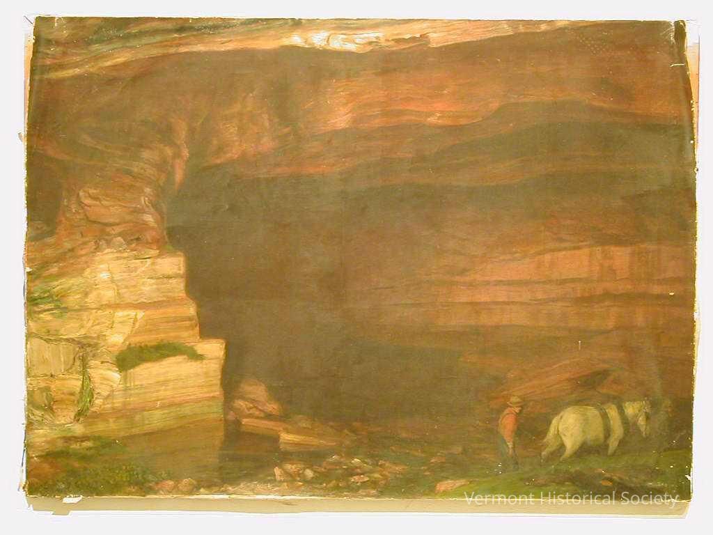 Unframed oil painting showing the entrance to a quarry. There is a man and white draft horse in the bottom right corner. The man is wearing blue overalls, a red shirt, and a brown hat. The entrance fills the composition. It is signed in the lower left corner, "Edwin B. Child".Type of Painting