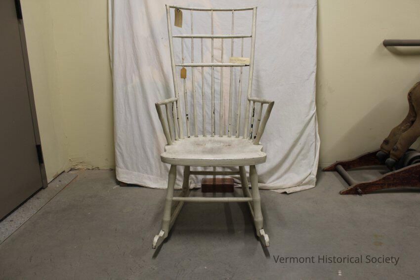 White-painted birdcage windsor rocking chair. The tall back is separated into three sections by horizontal rails.
