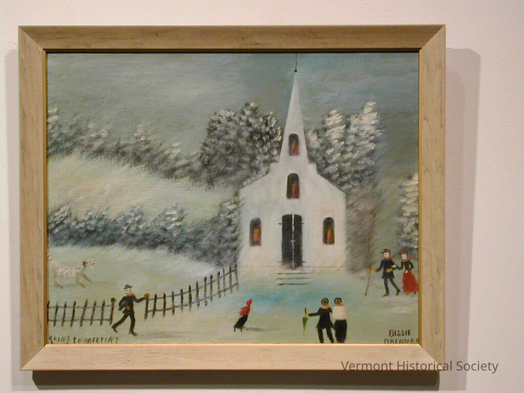 Bessie Drennan, a lifelong resident of Woodbury, Vermont, started painting near the end of her life. Her scenes, in the folk or naive style, became quickly collectible by locals and visitors alike. Though she produced her artwork at the same time as Grandma Moses, she never reached her level of fame.Made/Created