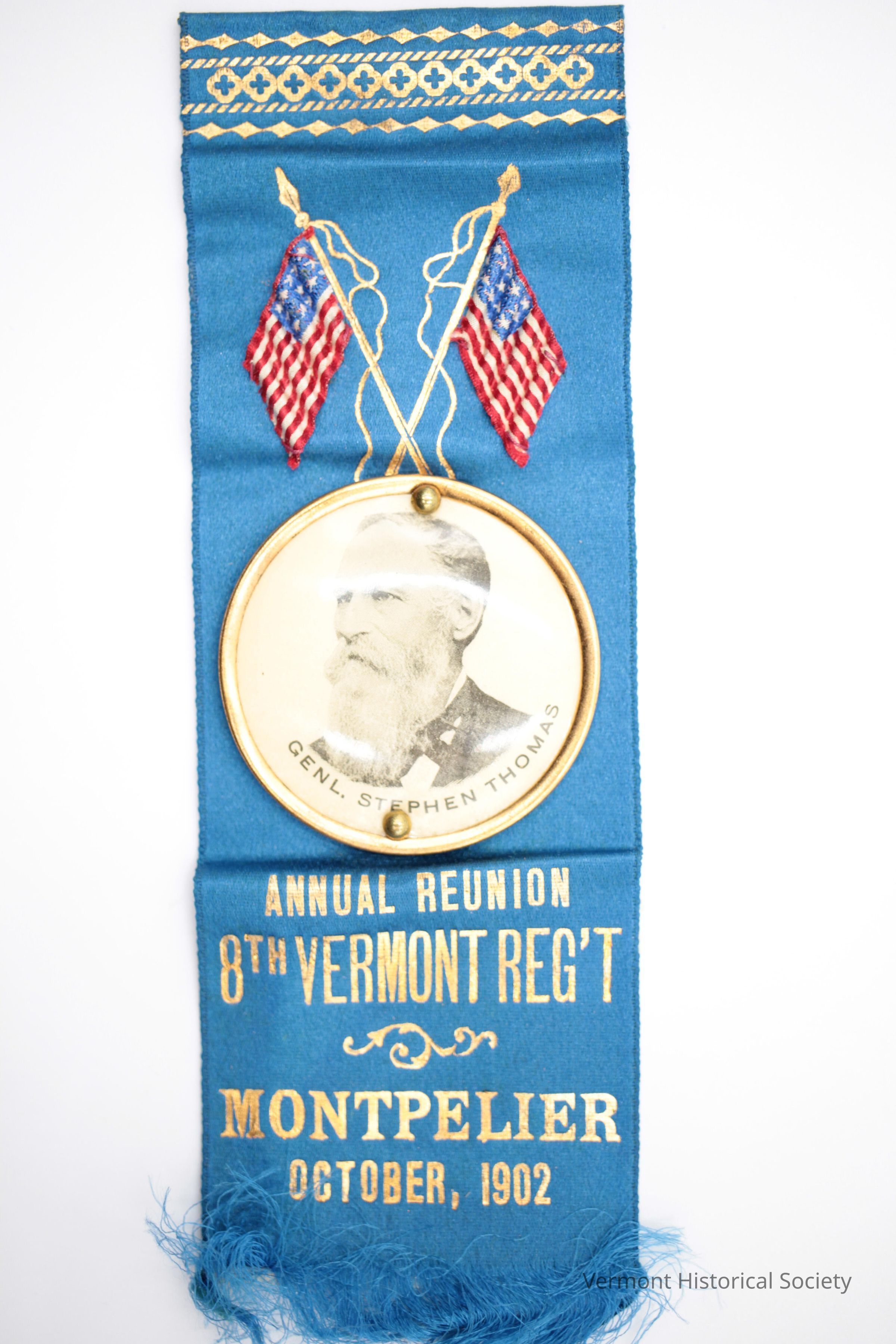 Bright blue and gold ribbon with two flags at the top, an attached portrait of Gen. Stephen Thomas and words printed in gold as follows: Annual Reunion, 8th Vermont Reg’t, Montpelier, October, 1902.Context