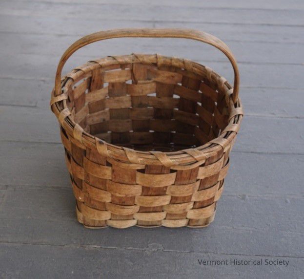 The small basket holding about a peck would be useful for carrying a few fruits and vegetables from the garden to the kitchen. It came from the same Fairfield, VT source as the large goose down basket (L2024.3.111) and was said to have been made by the same "Indian" family. This example is important in that it is the only one with a carved bail handle that can be assigned a Vermont provenance.