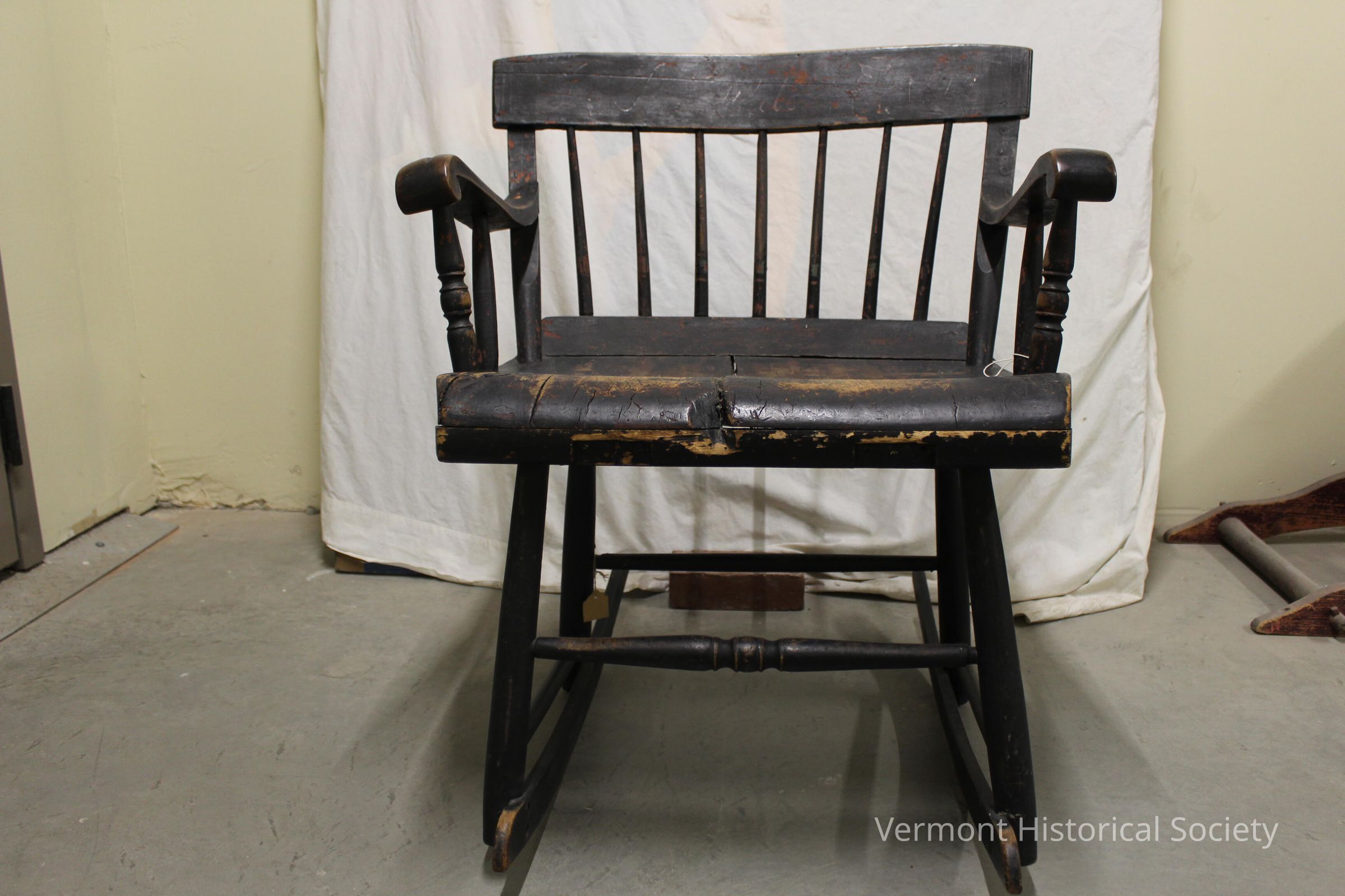 Black-painted windsor rocking chair. The chair has a low, canted back with a wide rail and 7 spindles. It has scrolled arms. The front of the seat is straight and scrolls downward. There is red paint visible on the crest rail that may be writing but is illegible. The bottom of the seat is painted with the red initials, "DRT".