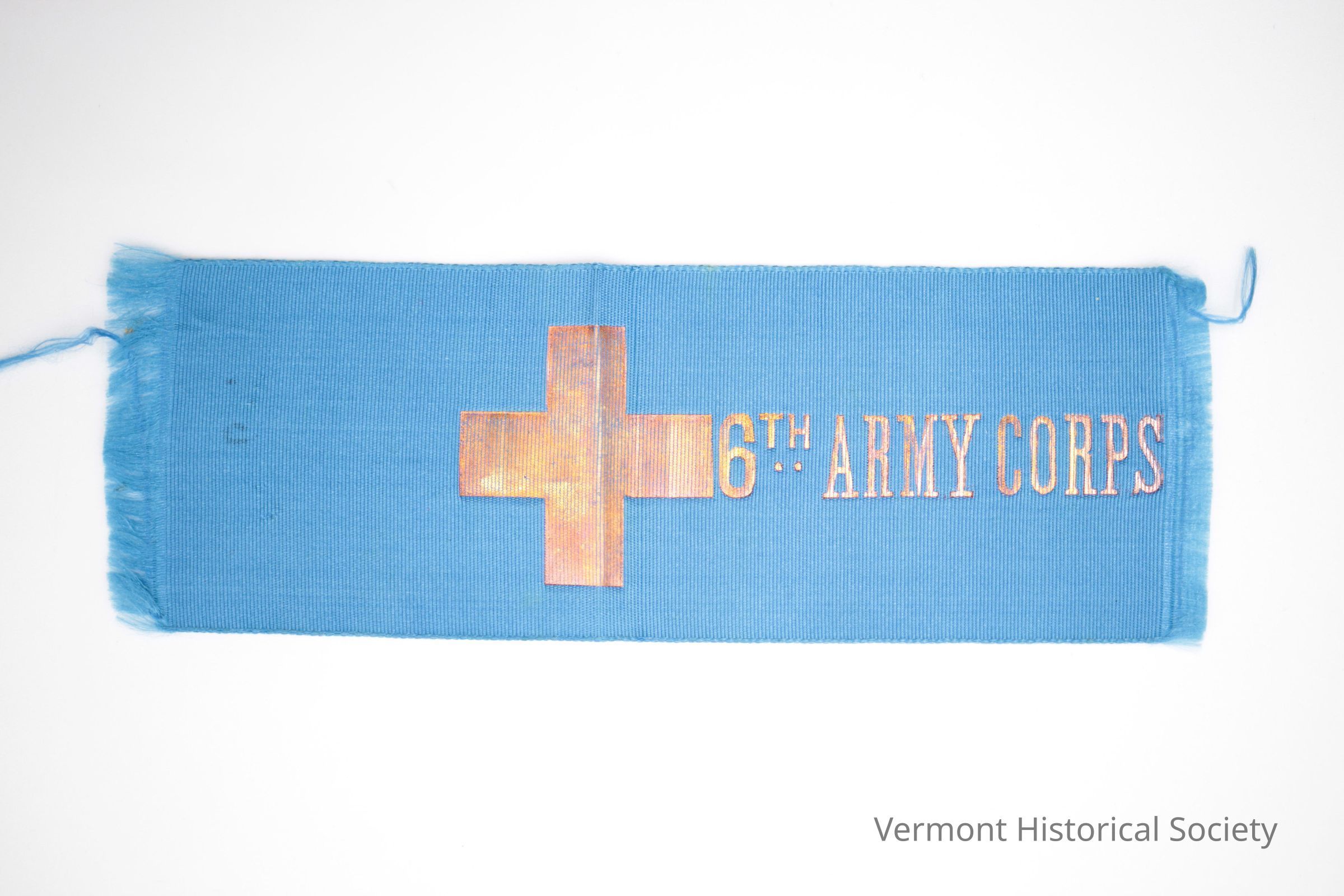 Bright blue ribbon on which is printed a gold cross and the words 6th Army Corps.Context
