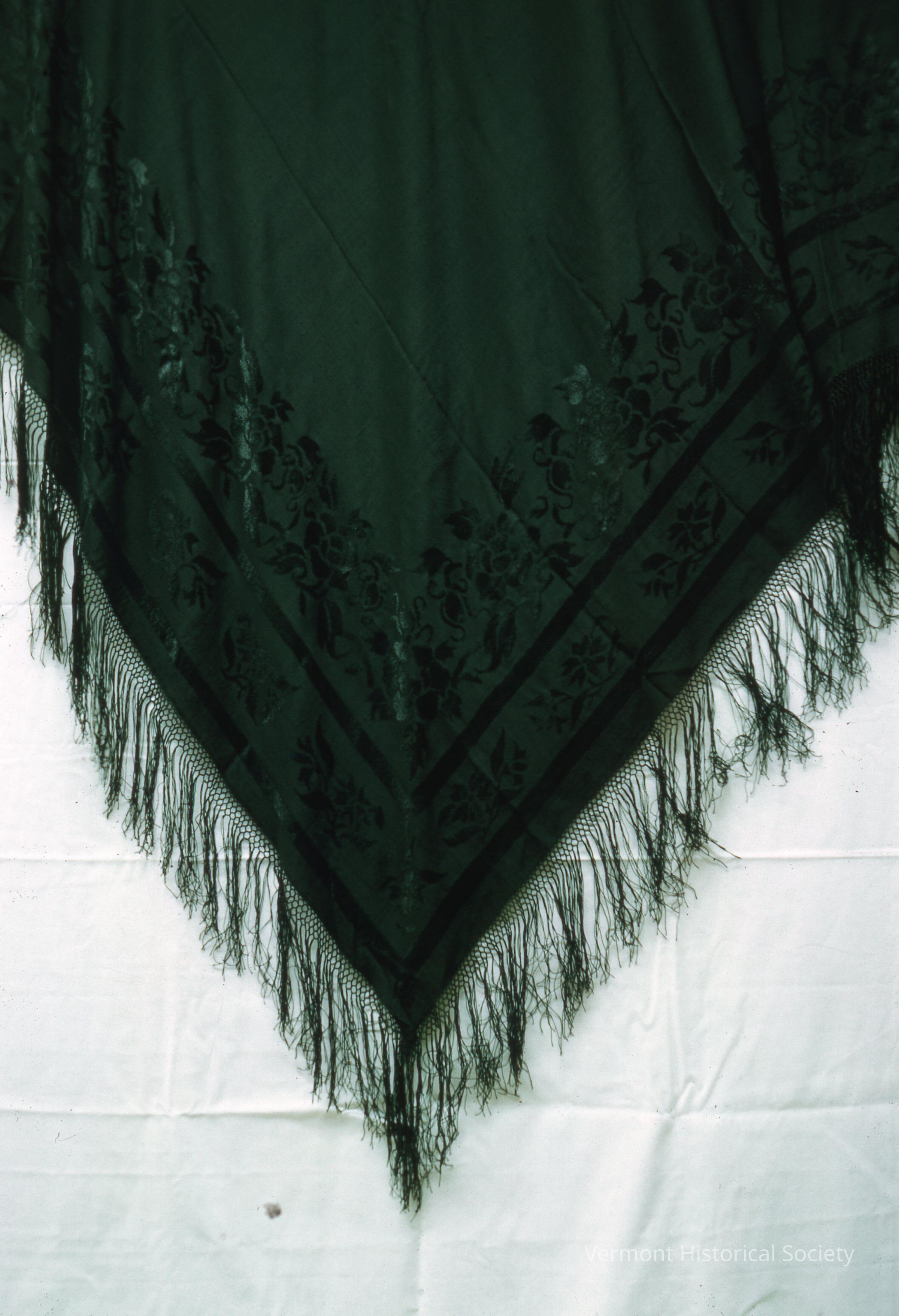 Black silk shawl with decoratively tied silk fringe. The borders are woven with a float pattern of flowers and vines.