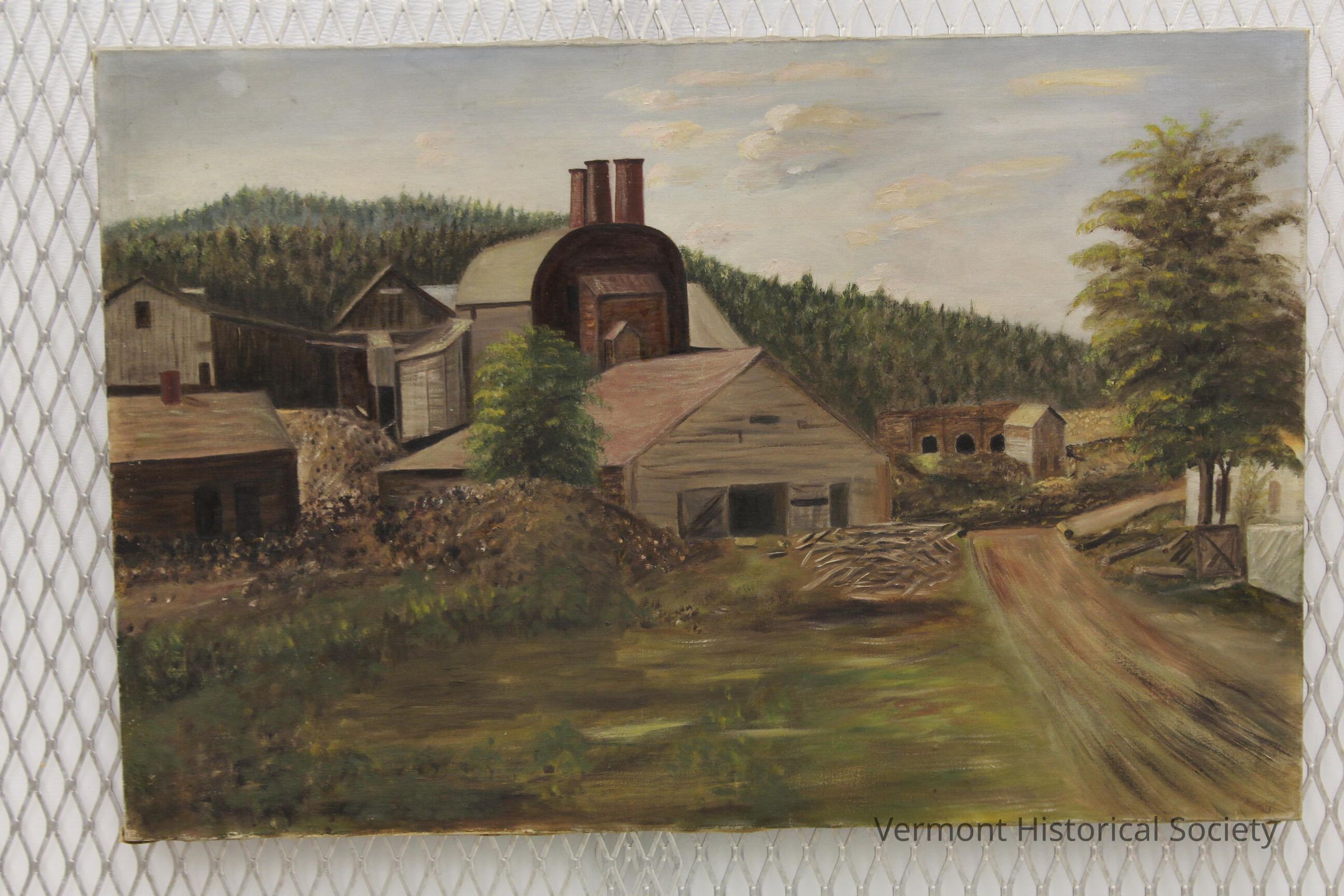 Oil painting showing a landscape consisting of several farm or industrial buildings on the side of a road. The largest building in the center is a furnace with three chimneys. A heavily wooded hill frames the background.