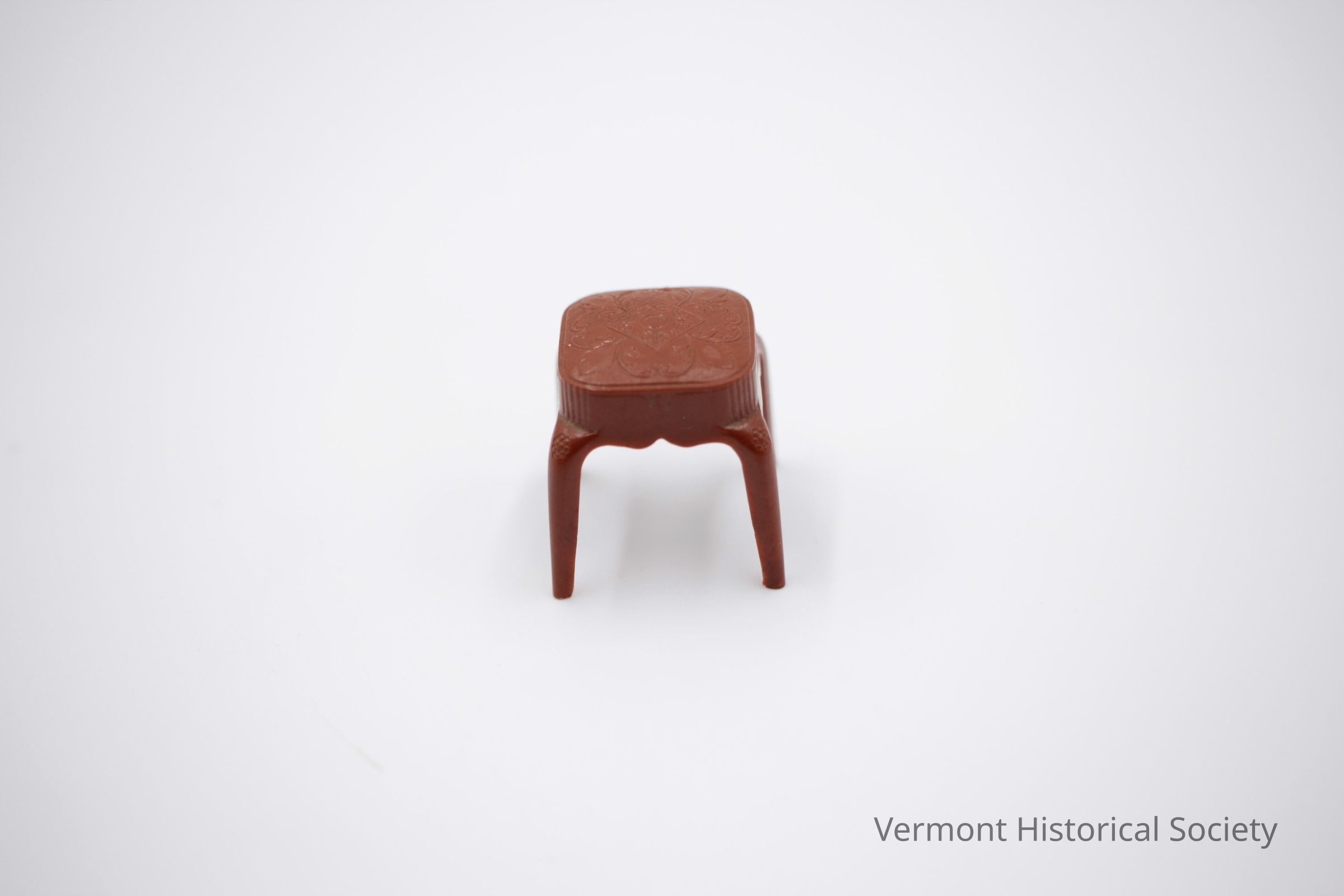 Miniature plastic footstool. The stool has a square seat and four legs. The seat is molded with the impression of flowers.Context