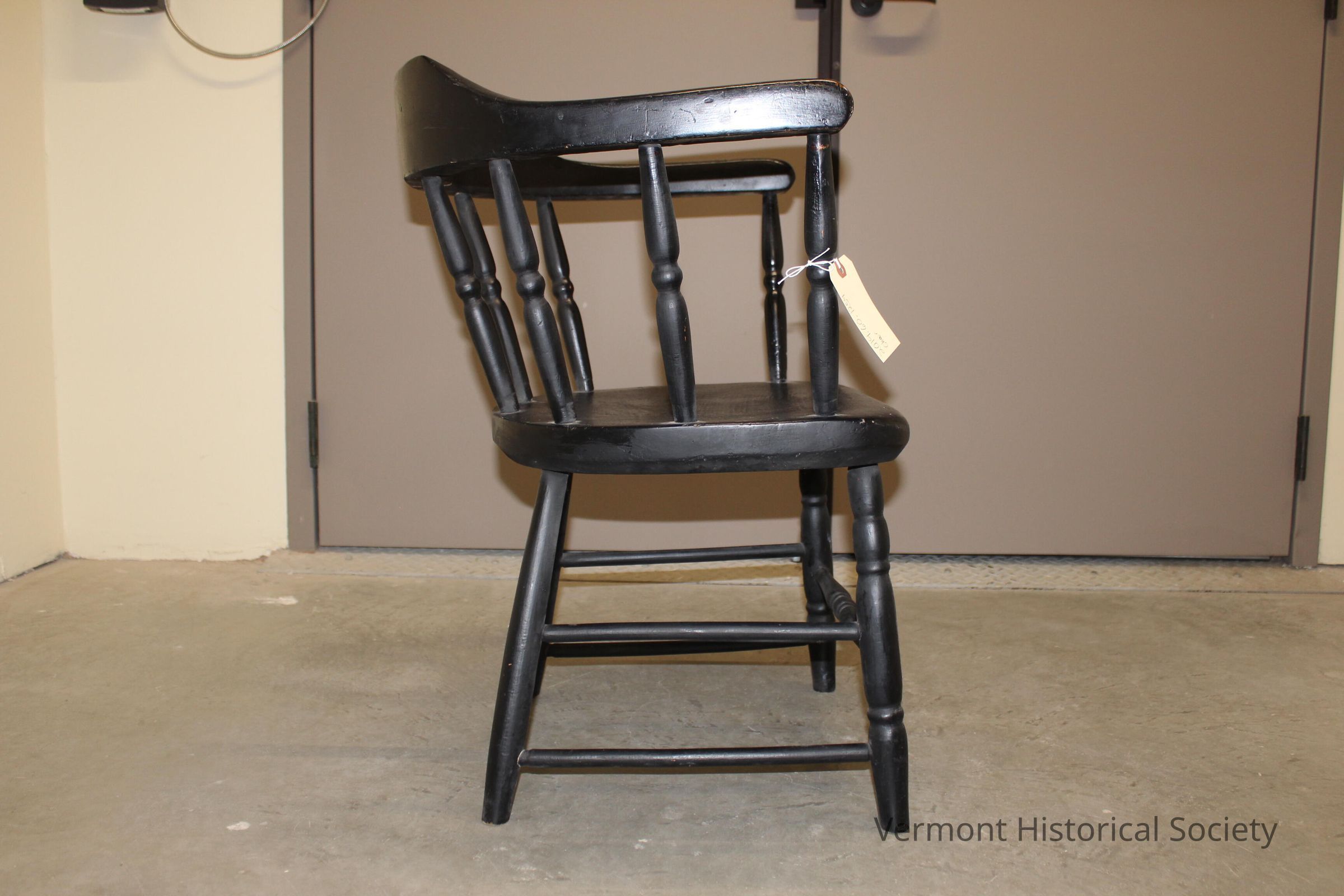 Black-painted captain's chair. It has 8 spindles and a thick crest rail that bends to become the chair's arms. There are two stretchers between the legs on either side, and 1 each in the front and back.