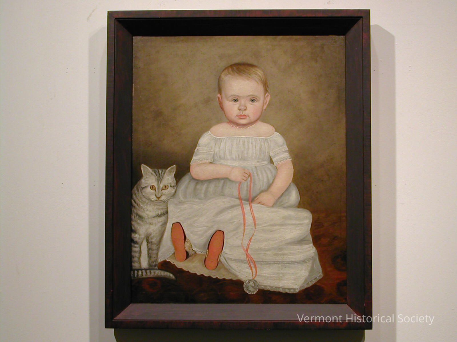 Portrait of a young child with a grey cat. The blond child is shown seated and wearing a long, white dress. The neckline sits off the shoulder, and the dress has short sleeves. The child is wearing a necklace, and has red-soled black shoes. It is holding a coin or medallion on a red ribbon. A grey striped cat sits at the left border of the painting..Type of Painting