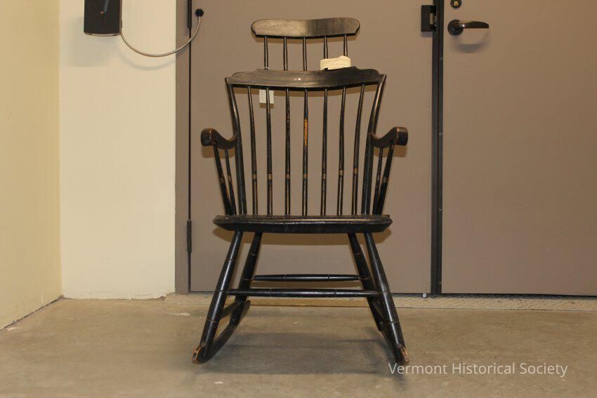 Black-painted windsor rocking chair. The back has 9 spindles and a straight rail with a headrest with 5 spindles and a straight rail at the top center. There are two scrolled arms, each held by 2 spindles. here are faded gold bands on each of the thin lower spindles and arm supports, probably old paint.Context