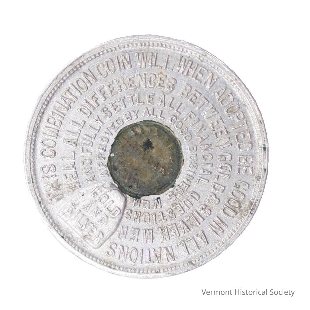 Bickford was not alone in attempting to create universal currency; many others had floated the theory or even gone so far as to create coins. None have been successful. Interestingly, Bickford's coin also attempts to heal another monetary divide: it claims to "heal all differences between gold & silvermen," referencing the raging debate in the latter part of the 19th century about whether US currency should be based on the gold or silver standard.