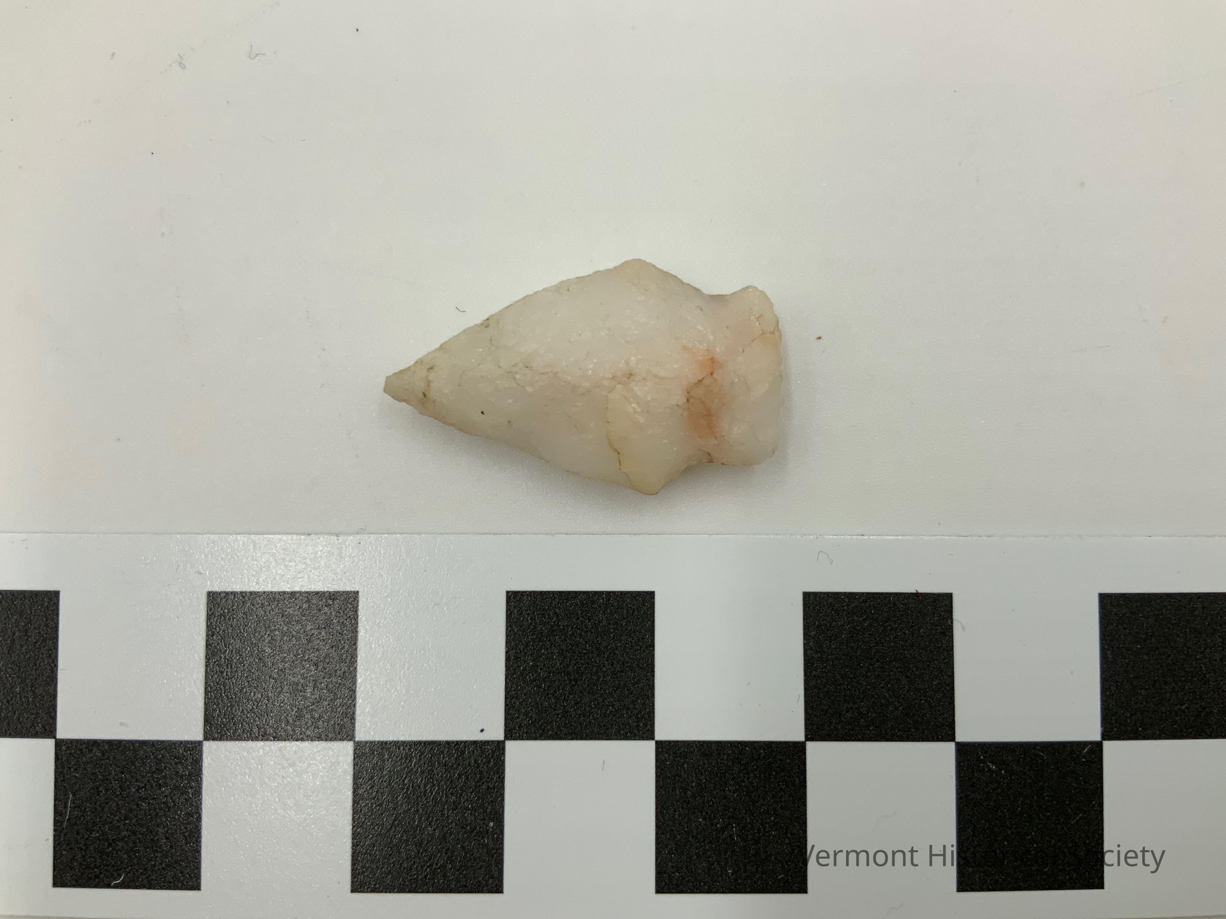 White chipped stone projectile point with an expanding stem. It has a straight base and straight blade edges. It is made of quartz.