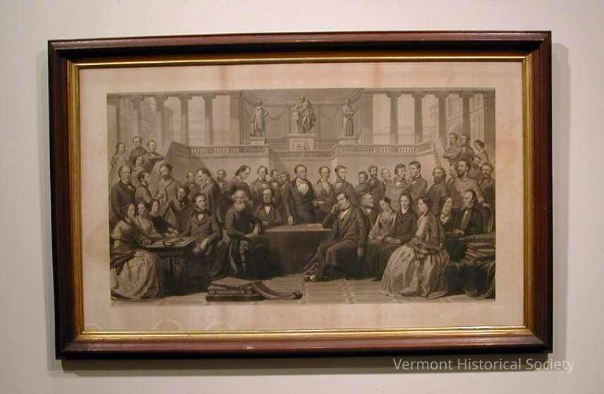 Framed print showing a large group of men and women in 19th-century clothing in a classical interior or courtyard. There are three tables around which people are seated, and stairways flank the scene, with people standing on the stairs. Numerous people stand behind those seated around the tables.