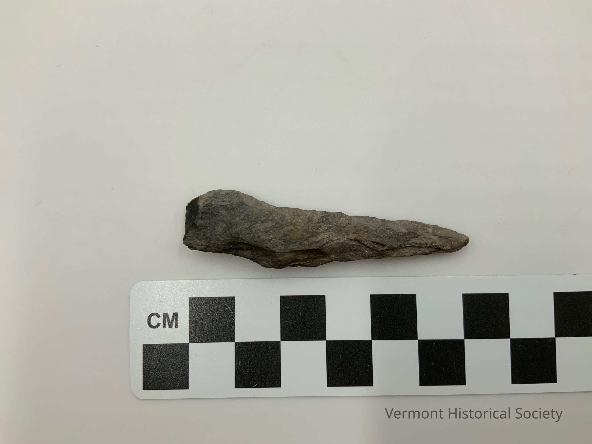 Chipped stone drill. The base is broken off, giving the drill a long narrow shape.