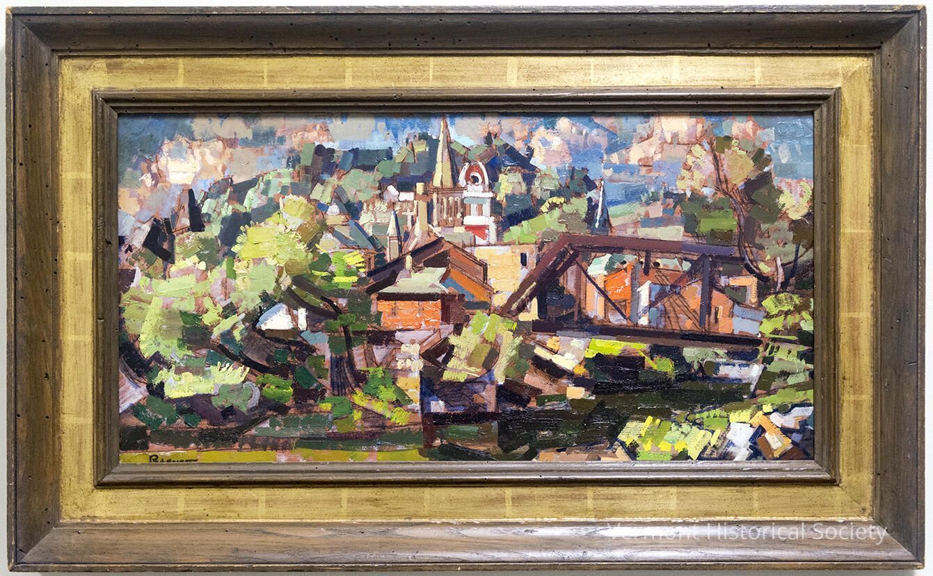 Herbert Barnett (1910-1972) was born in Providence, Rhode Island and studied art at the Rhode Island School of Design, The Boston Museum of Fine Arts, and in Europe. He taught at UVM in 1943. Barnett's abstract Cubist style shows Montpelier's downtown with the steeple of Christ Church in the center background on the Washington County Courthouse tower on the right.