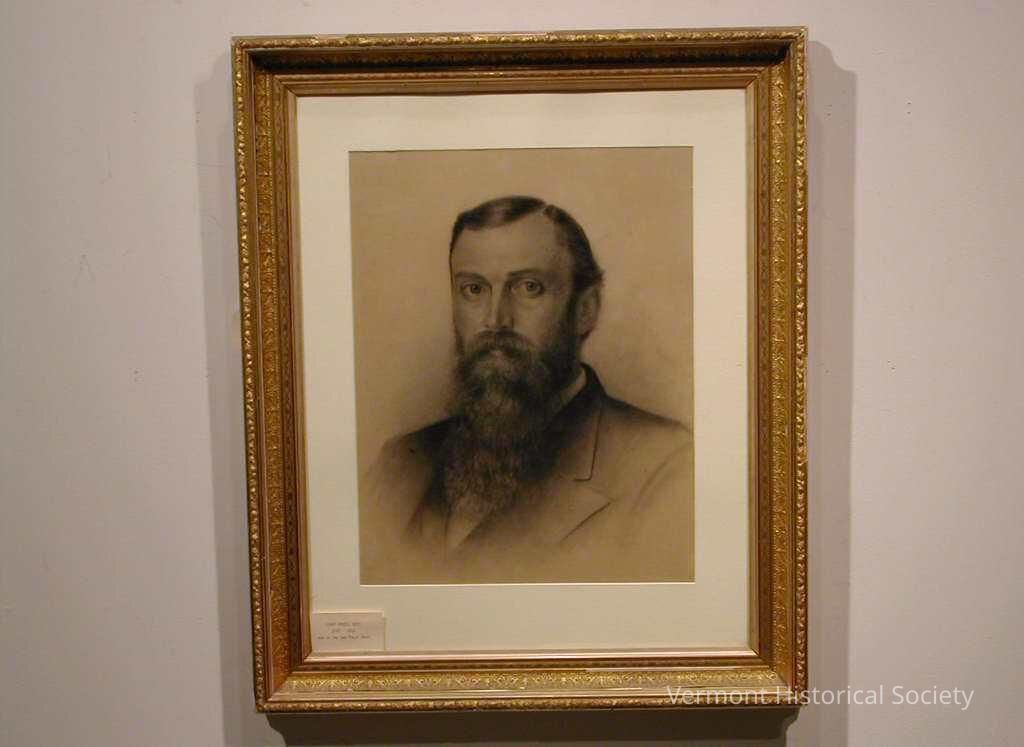 Charcoal bust portrait of a white man with short, dark-colored hair and a long beard. He is wearing a dark suit and white shirt. It is signed along the line of his lapel, "J. F. Gilman '80". It is framed in a gilded wood frame with a white mat.Type of Drawing