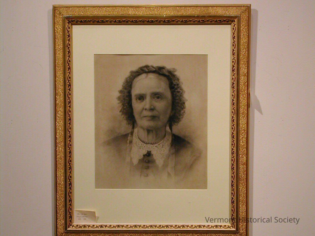 Charcoal drawing of an elderly white woman with white hair. She is wearing a ruffled bonnet that sits back from her face. She is wearing a dark-colored bodice with a pointed, white lace falling collar. It is framed in a gilded wooden frame with a white mat.Type of Drawing