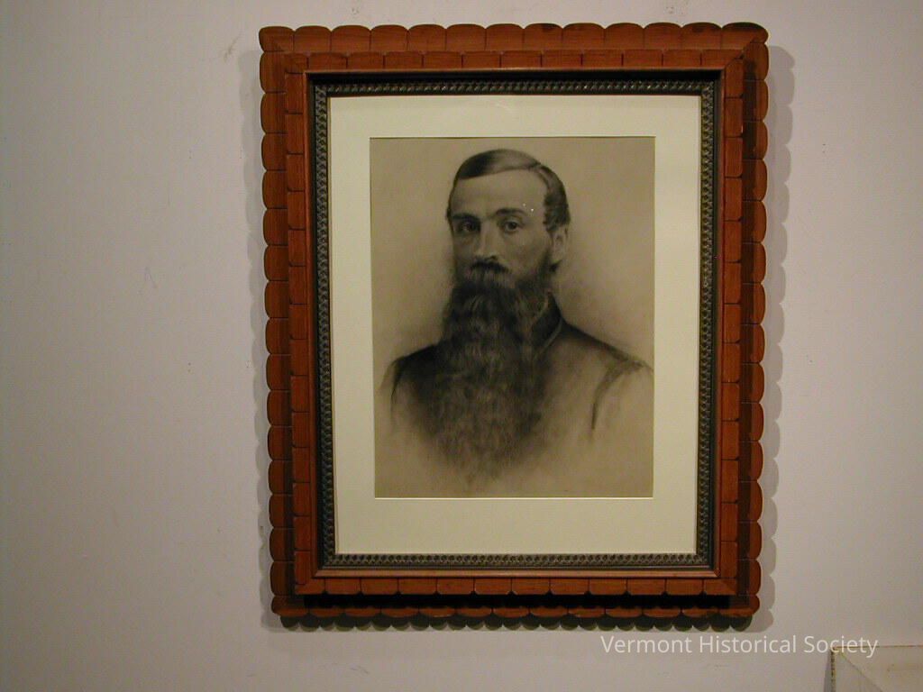 Charcoal bust portrait of a white man with short, dark-colored hair and a long beard. He is wearing a dark suit that is possibly a military uniform. It is signed along the line of his shoulder seam, "J. F. Gilman '80". It is framed in a scalloped wood frame with a white mat.Type of Drawing
