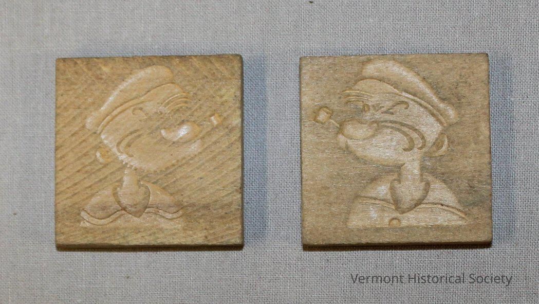 Two square wooden blocks press carved with images of Popeye on one side. The back sides are undecorated.