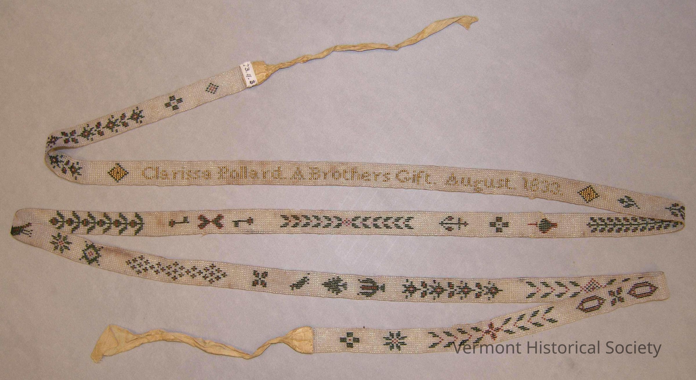 Loom beaded belt woven with the words, "Clarissa Pollard. A Brothers Gift. August. 1833.", and repeating floral elements.Context