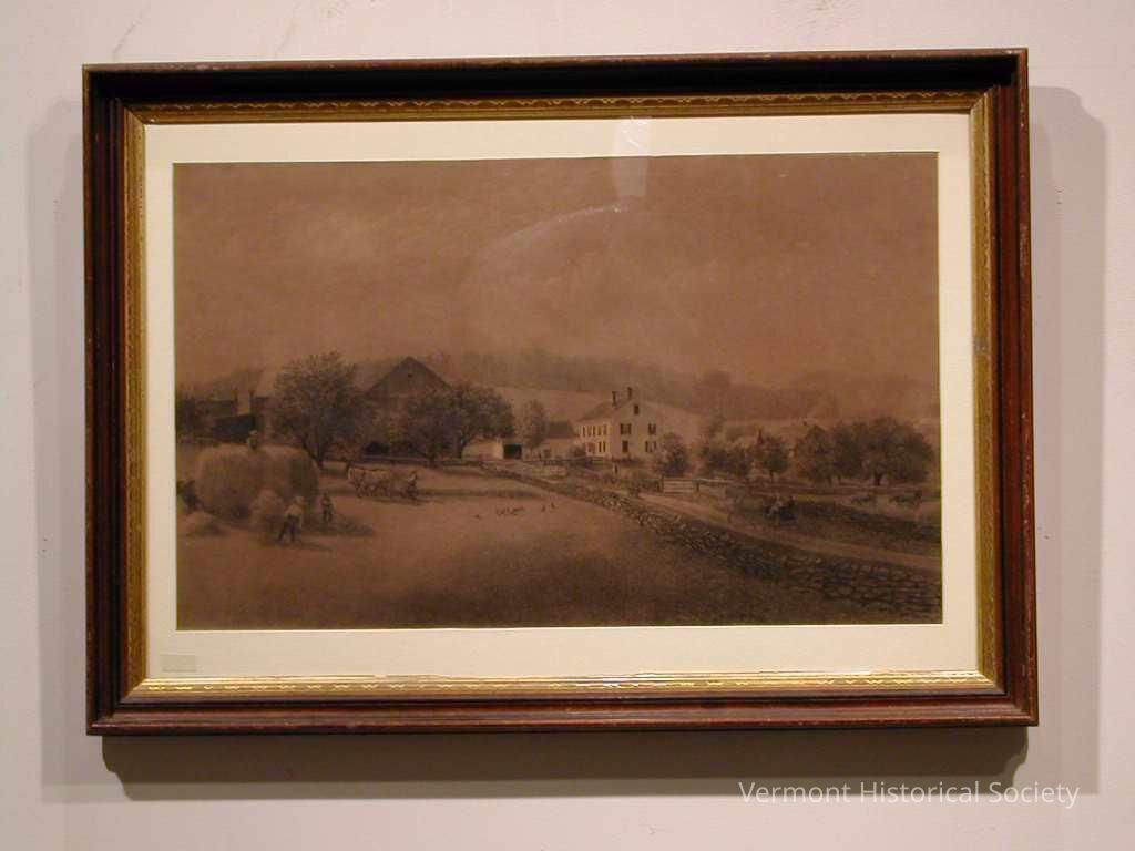 This is a landscape drawing that depicts a pastoral scene. In the left-hand side of the drawing, there is a hayfield with oxen and a wagon, and three men are loading hay onto the wagon. Behind the barn in the background, there are apple trees. On the right-hand side of the drawing, there is a road that leads up to a farmhouse, with stone walls on either side. A horse and buggy can be seen traveling along the road. The farmhouse, which has white walls and black shingles, has a carriage house attached to it. In the foreground, there is a meadow that leads uphill to a forest in the background.Type of Drawing