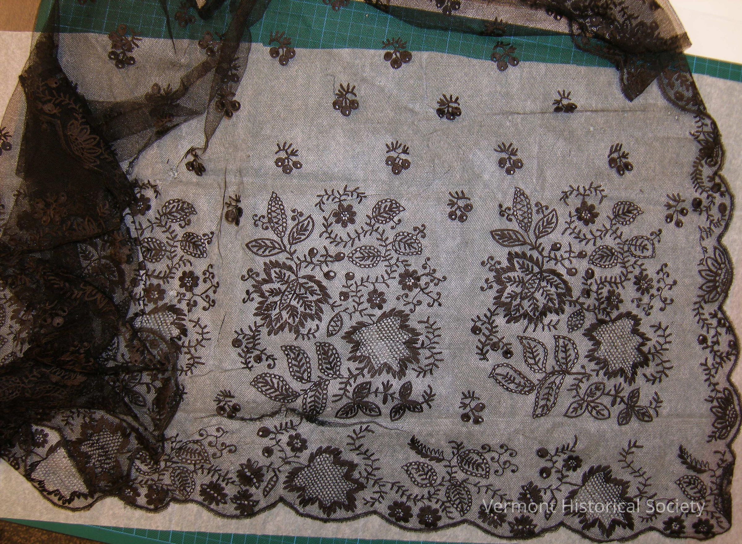 Rectangular black lace veil or shawl with scalloped edges on three sides. The consists of black embroidery on woven netting. The embroidery is in designs of maple leaves, flowers, and berries on one end, and sprigged with berries through the center.