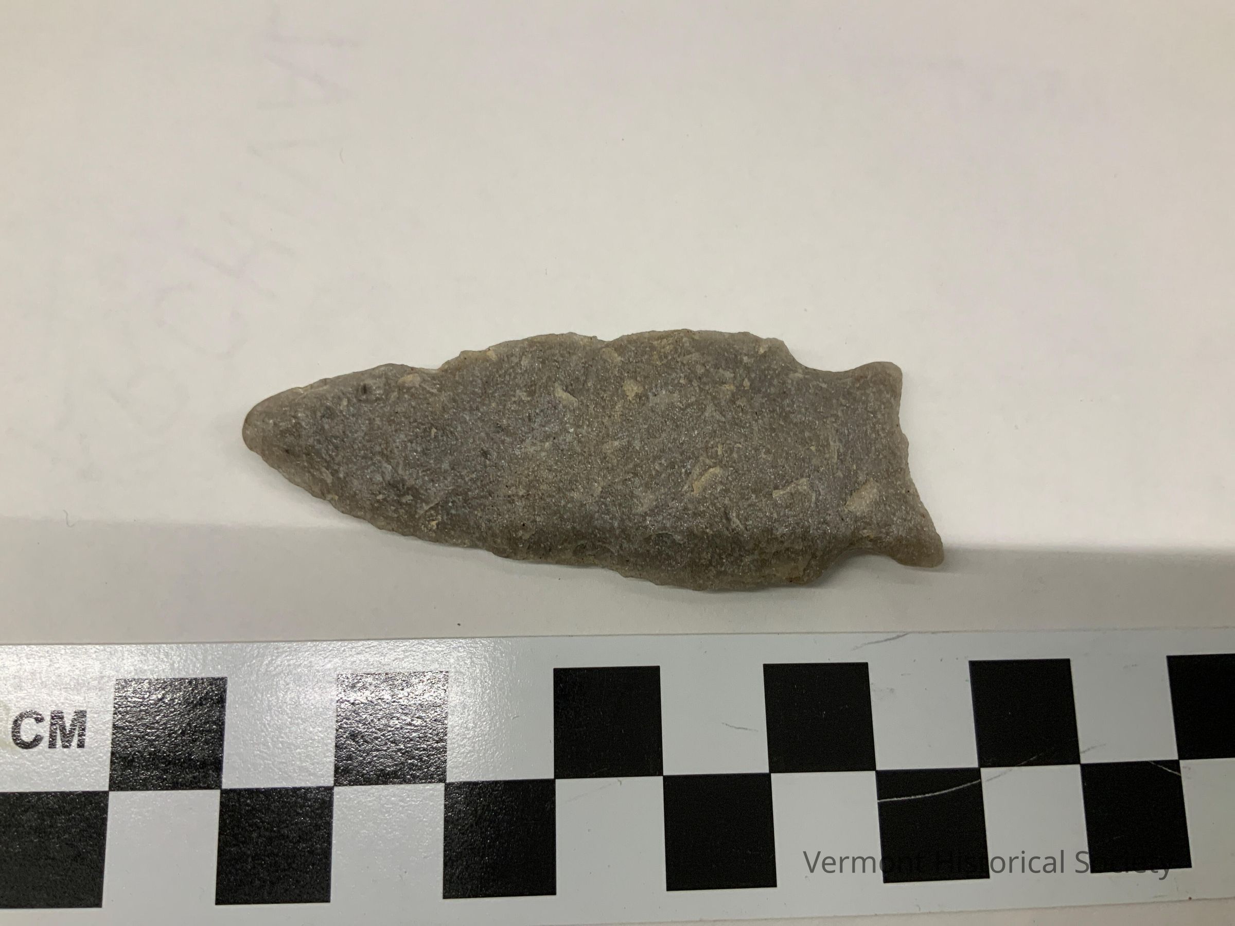 Gray chipped stone projectile point with side notches. The base is thinned and curves inward slightly. The blade edges curves outward and our asymmetrical.Context